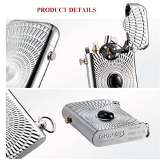 Centered on a black circular “Eye of Diamond” element, the front face establishes a strong visual focal point that contrasts against the surrounding metallic surface. Radiating engraved lines extend outward from the center, creating depth and directional movement while emphasizing the lighter’s mechanical character. The design balances symmetry, weight, and tactile presence without relying on decorative excess.
