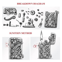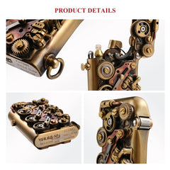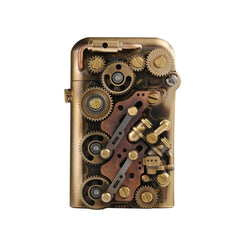Built around steampunk mechanical aesthetics, this lighter presents a design language inspired by miniature engine structures. The construction openly displays metal components, gear motion, and metal assembly, emphasizing mechanical visibility and layered industrial form rather than concealed mechanisms.